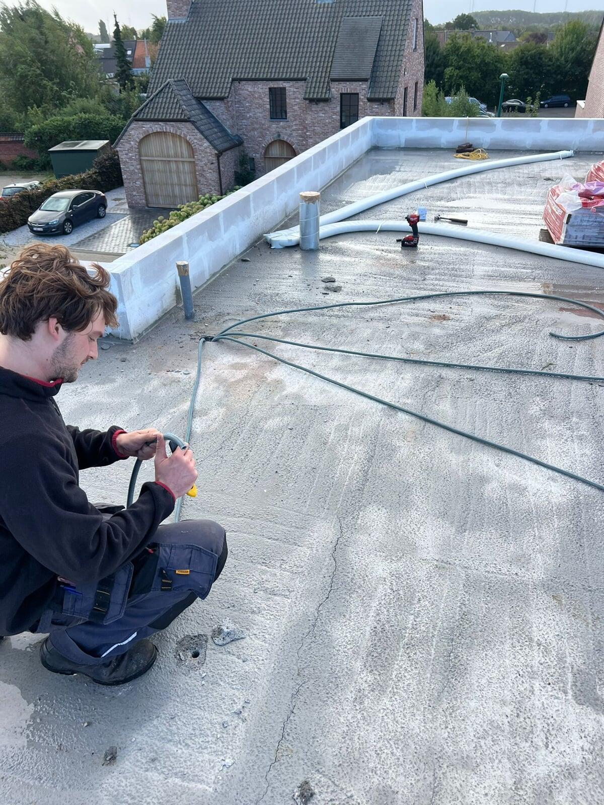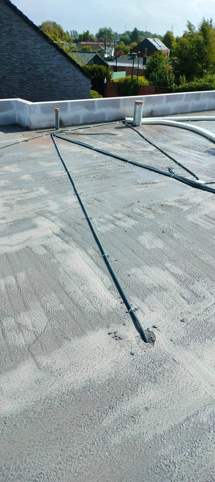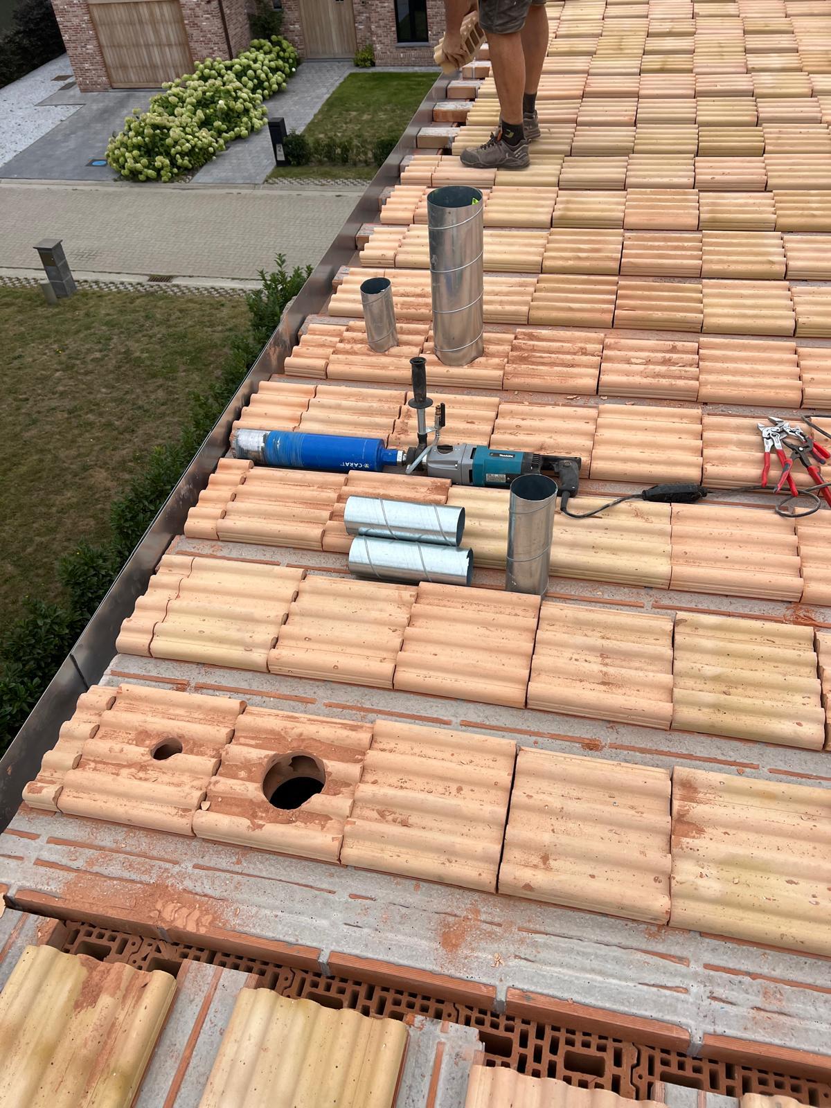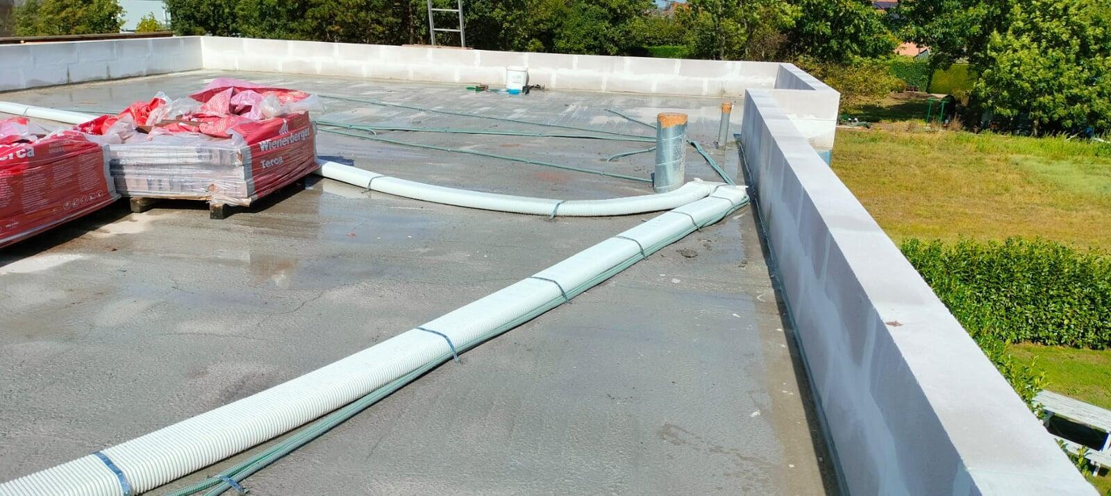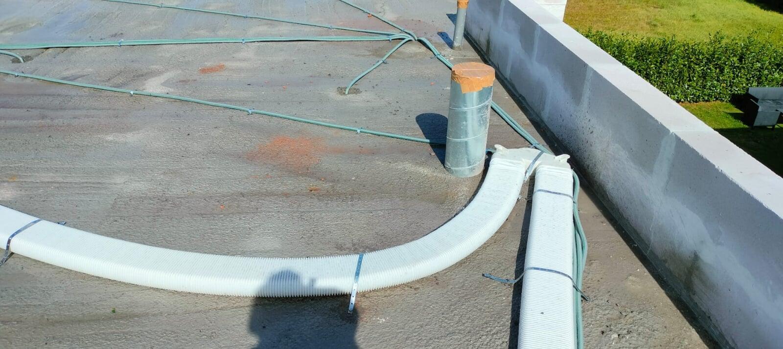 Op plat dak al de ventilatie instortkanalen geplaatst en de verlichtingskabels zodat het dak afgewerkt kan worden.